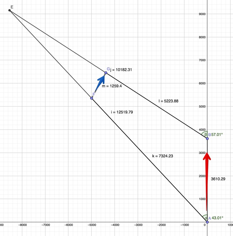 El otro ángulo en B es 180-57 = 123. El último ángulo (C) en el triángulo negro es por lo tanto (180-1230-43) = 14. Las longitudes de los otros dos lados se pueden calcular como 3610/sin (14 grados)*sin(43 grados) = 10177 y 3610/sin(14 grados)*sin(123 grados) = 12514