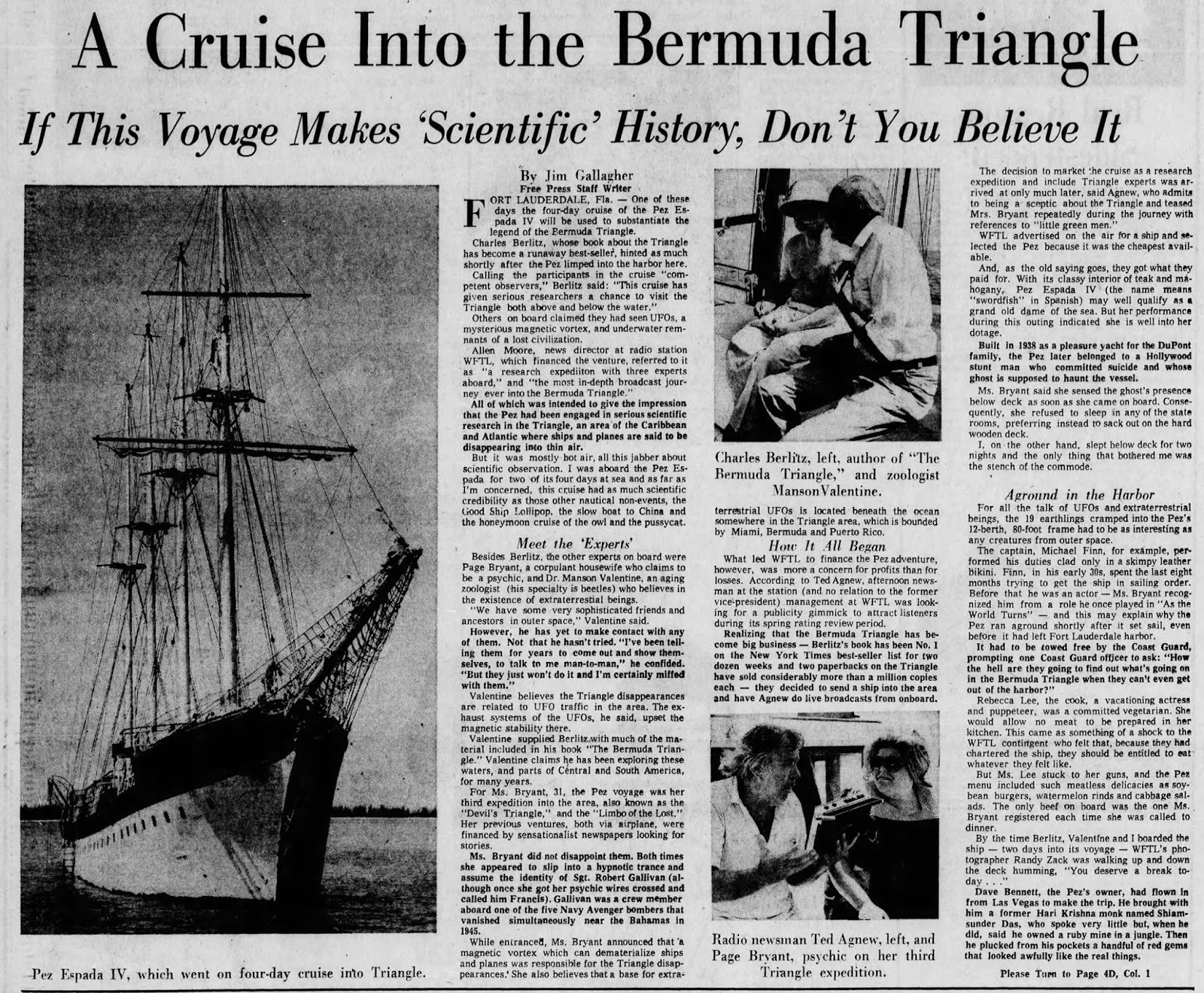 Además de Berlitz, los otros expertos a bordo fueron Page Bryant, una ama de casa corpulenta que dice ser psíquica, y el Dr. Manson Valentine, un zoólogo anciano (su especialidad son los escarabajos) que cree en la existencia de seres extraterrestres. «Tenemos algunos amigos y ancestros muy sofisticados en el espacio exterior», dijo Valentine. Sin embargo, aún no se ha contactado con ninguno de ellos. No es que no lo haya intentado. «Les he estado diciendo durante años que salgan y se muestren a sí mismos, que me hablen de hombre a hombre», confió. «Pero ellos simplemente no lo hacen y ciertamente estoy enojado con ellos». Valentine cree que las desapariciones del Triangulo están relacionadas con el tráfico de ovnis en el área. Los sistemas de escape de los ovnis, dijo, alteran la estabilidad magnética allí. Valentine suministró a Berlitz gran parte del material incluido en su libro «The Bermuda Triangle».