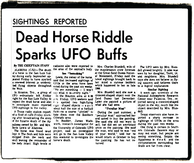 Dermot y Carl relatan el caso de un caballo mutilado llamado Lady (que normalmente se llama Snippy en los medios de comunicación y libros de ovnis) que se descubrió en septiembre de 1967 cerca de algunas huellas radiactivas extrañas en el suelo. Este fue probablemente el primer caso de mutilación animal relacionada con ovnis, y en la década de 1970 las mutilaciones de ganado vinculadas a la aparición de helicópteros misteriosos se hicieron tan frecuentes en partes de los EE. UU. que se convirtieron en el tema del documental de 1980 A Strange Harvest por Linda Moulton Howe.