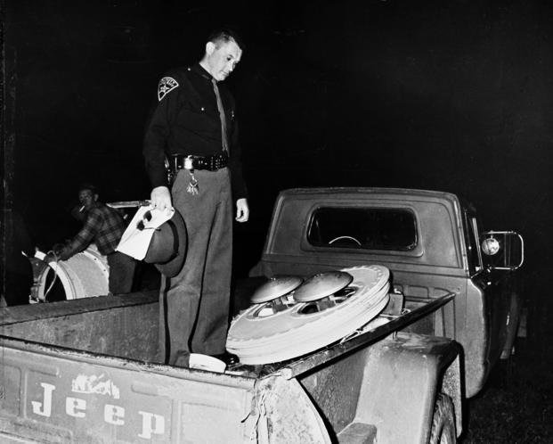 El alguacil adjunto del condado de Pickaway, John Wolford, supervisa la carga de una parte de un globo de la Fuerza Aérea que descendió del cielo en tierras de cultivo del centro sur de Ohio, el 19 de abril de 1966. (Foto AP)