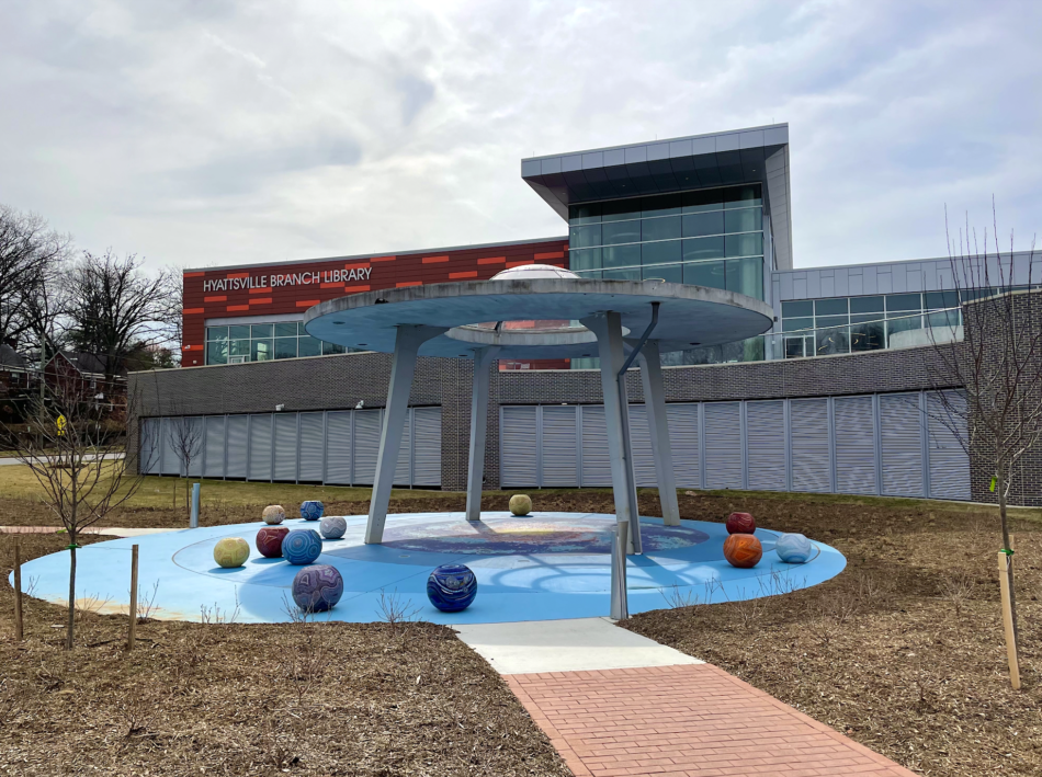 También presenta instalaciones de arte encargadas por Valerie Theberge, quien creó un mural de mosaicos al aire libre debajo del platillo volador renovado, y Curtis Woody, quien creó un gran mural dentro de la entrada de la biblioteca en honor a la historia de Hyattsville y la comunidad en general.