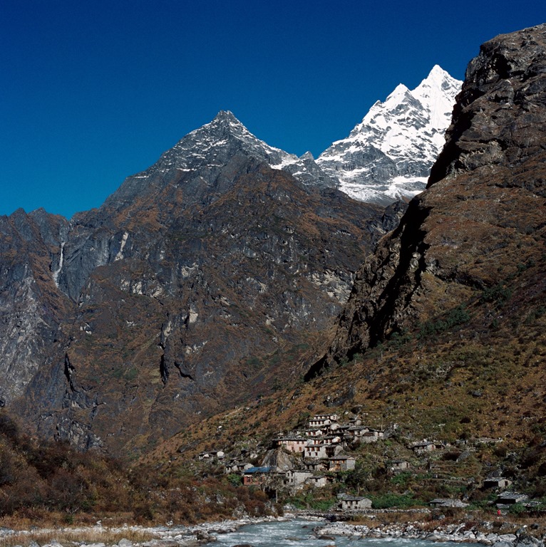 El pequeño pueblo de Beding, inundado de historias de avistamientos de yeti, sirvió como campamento base de la expedición. BIBLIOTECA DE IMÁGENES DE DE AGOSTINI/GETTY IMAGES