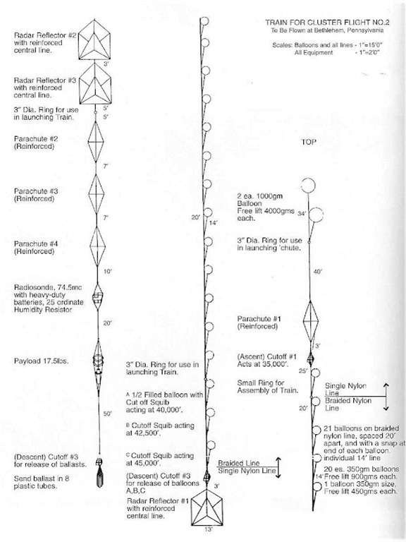 La afirmación con subtítulos engañosos de que esta matriz, incluidos los objetivos de radar Rawin, fue lanzada por científicos de la Universidad de Nueva York el 4 de junio de 1947. Este fue en realidad el Vuelo No. 2, volado en la costa Este. Los conjuntos lanzados en Nuevo México eran un tercio más cortos y no llevaban blancos crudos.