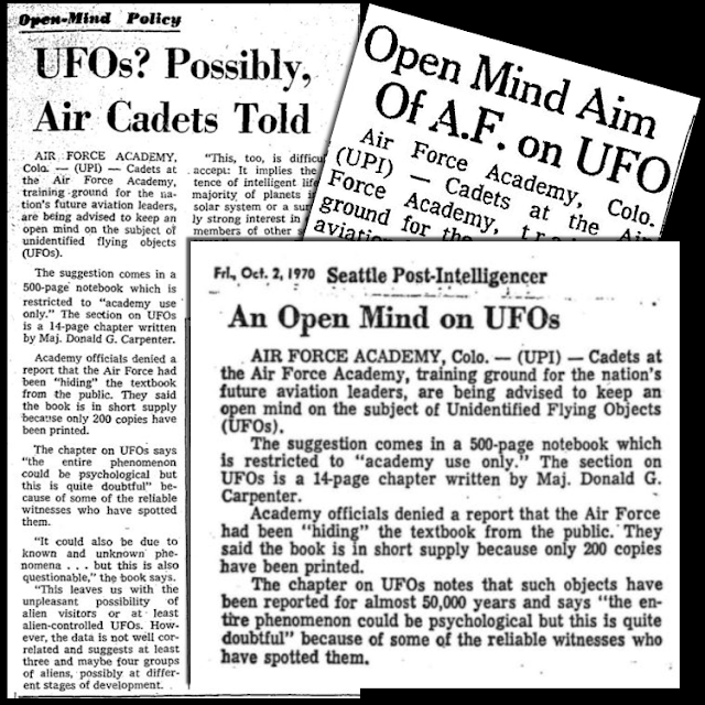 1 GIF Carpenter - Unidentified Flying ObjectsLa Academia utilizó el libro de texto de Carpenter durante los semestres de otoño y primavera de 1968-69 y 1969-70. Poco después de que comenzara el semestre de 1970, los medios nacionales publicaron la noticia de que la Fuerza Aérea estaba enseñando a sus cadetes sobre ovnis y extraterrestres.