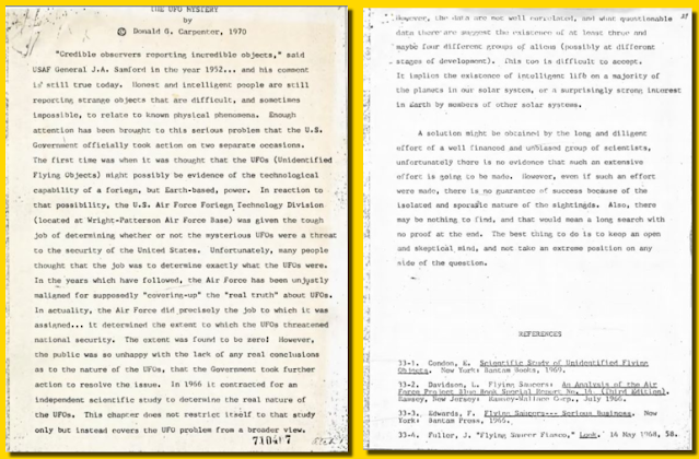 1970 The UFO MysteryEn 1970, el Mayor Carpenter hizo una revisión completa de su capítulo 33 original, conservando el tono original, pero reordenado, corregido y actualizado. También incorporó datos del sustituto del semestre de otoño de 1970 de 7 páginas del Capitán Peterson. Se distribuyeron de forma privada copias del manuscrito de 28 páginas, y una llegó a manos de Dord Fitz, un profesor de arte ambulante interesado en lo paranormal.