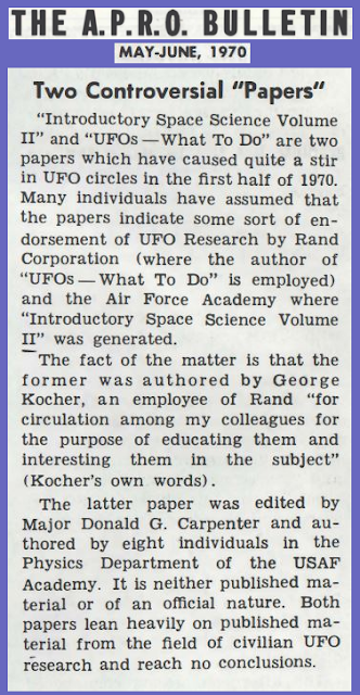 APRO Bulletin May-June 1970APRO lo hizo bien, pero pocos prestaron atención. El capítulo no se extrajo de datos o investigaciones ovni originales, se escribió sin ningún aporte del Proyecto Libro Azul. Carpenter hizo un intento de buena fe de examinar el conjunto de conocimientos sobre los ovnis. Su error fue incluir material de libros escritos por algunos autores descuidados e imaginativos en la prensa popular.
