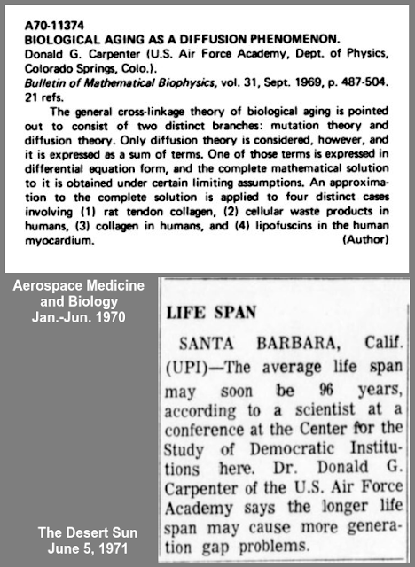 Mientras trabajaba en su BS en Wright-Patterson AFB, “A fines de 1959, el Dr. Donald G. Carpenter dedujo la teoría [de extender la vida humana] a partir de estudios de ciencia nuclear y efectos de la radiación”. Diseñando el futuro: el papel de la previsión tecnológica por Robert W. Prehoda, 1967.
