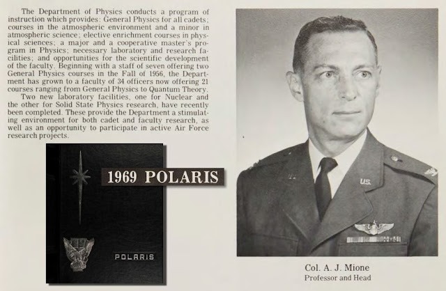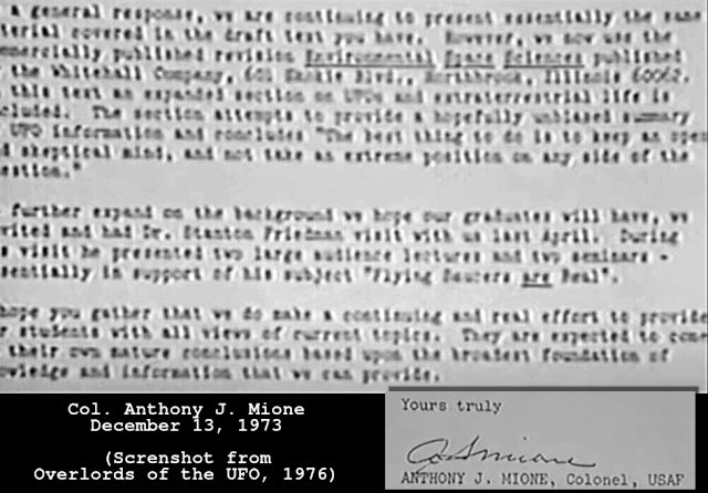 Mione Polaris AFA Yearbook 1969Cuando se le preguntó sobre el capítulo del libro de texto de la Academia de la Fuerza Aérea sobre ovnis, el 13 de diciembre de 1973, el coronel Anthony J. Mione le respondió a William Gordon Allen, diciendo que todavía estaban enseñando el tema como parte de Physics 370: