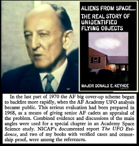 “ Aliens From Space es principalmente un trabajo de corrección, muchas secciones se sacaron intactas de las páginas del boletín informativo de NICAP… Hay muchas distorsiones de los hechos, algunas de ellas aparentemente deliberadas; y omisiones trágicas… Incluso arrastra el Libro de Dzyan, citando el célebre texto ovni de la Academia de las Fuerzas Aéreas que, dicho sea de paso, fue compuesto por un fanático de los platillos voladores y no representaba en absoluto la posición de esa agencia. El Libro de Dzyan no es un documento antiguo, sino que fue compuesto por la querida anciana Madame Blavatsky en el siglo XIX. Keyhoe solo cita la basura de la Academia AF que, él debe haber sabido, fue robada casi en su totalidad de Frank Edwards”.
