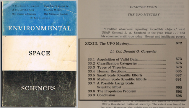 “El capítulo fue escrito en 1968 por el Mayor (ahora Teniente Coronel) Donald G. Carpenter… a pedido de sus superiores, que querían actualizar el material educativo que usaba el Departamento de Física, Carpenter no tenía la obligación de buscar trabajo de autorización de el Pentágono u otra alta oficina de la Fuerza Aérea. Presentó el libro de texto a la oficina de información pública de la Academia, pero no se planteó ninguna objeción al capítulo ovni.