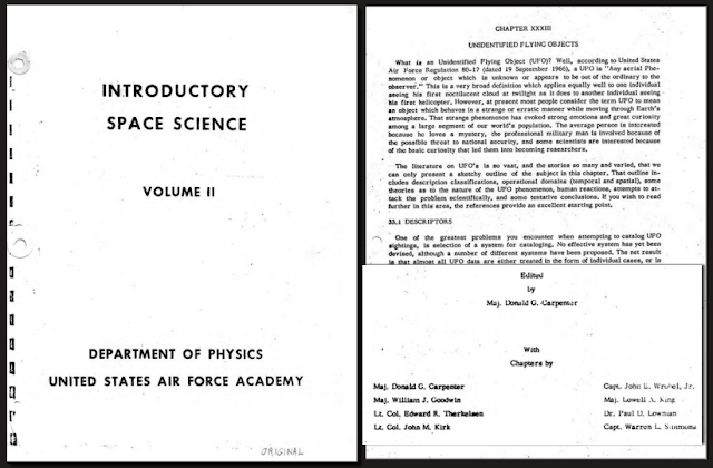AFA Physics 1969United States Air Force Academy - PhysicsBajo la supervisión de Mione en 1968, la Academia impartió un curso para cadetes de tercer año, Physics 370, utilizando Introductory Space Science , el libro de texto editado por Major Donald G. Carpenter. Los 33 capítulos del libro fueron escritos por Carpenter y otros expertos de la Fuerza Aérea, y se publicaron para el semestre de otoño de 1968 del curso. Como lo describió más tarde la Fuerza Aérea, era “un libro de texto de 470 páginas impreso por la AFA, [es] utilizado por aproximadamente 20 cadetes cada semestre que están inscritos en Física 370, un pequeño curso electivo”. Según los informes, la AFA imprimió 200 copias, para uso exclusivo de la clase. El libro constaba de dos volúmenes encuadernados en espiral con un total de treinta y tres capítulos. Fue la sección final la que causó un revuelo en las noticias cuando se corrió la voz: “Capítulo XXXIII Objetos voladores no identificados”.
