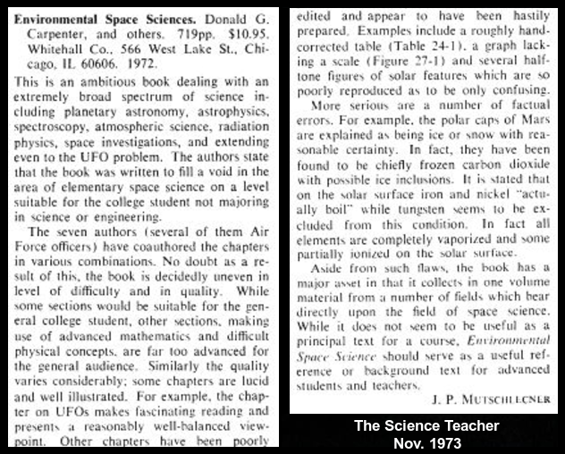 “Environmental Space Sciences es un libro que se enseña en la Academia de la Fuerza Aérea… El Coronel Carpenter tuvo la amabilidad de enviar a Eastern MUFON el libro que editó y escribió con otros seis oficiales. La mayor parte del libro se refiere a la ciencia del espacio, el Sol, los planetas, los plasmas, los campos magnéticos, la radiación, los meteoros, los planetas, el polvo espacial, la química del cosmos, los planetas y las lunas… Todos los capítulos son de interés para el ufólogo, como como la Búsqueda de Vida Extraterrestre, pero lo más importante es: Capítulo XXXIII, El Misterio ovni”.