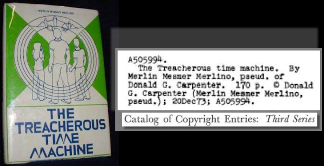 1973 science fiction novel – The Treacherous Time Machine under the pseudonym “Merlin Mesmer Merlino.” Self-published via Vantage Press, 1973.
