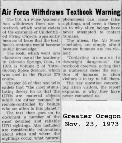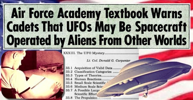 “Un libro de texto utilizado por la Academia de la Fuerza Aérea para enseñar a los cadetes les advierte que los objetos voladores no identificados (ovni) podrían ser naves espaciales reales operadas por pueblos extraterrestres que observan de cerca el mundo”.