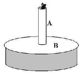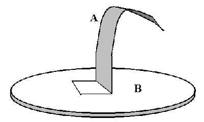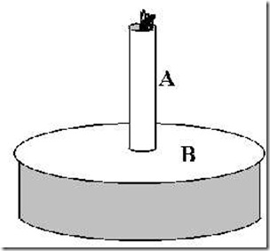 Este es el Diseño 1. Corte un disco “B” de aluminio o cobre, de 2.4 pulgadas de diámetro. Suelde o pegue con cinta una pieza de lámina de metal “A” de 1.5 pulgadas de largo en su punto medio, corte una punta afilada en el extremo libre y dóblela a unos pocos centímetros del borde del disco como se muestra. El papel de aluminio funciona, pero no es duradero, como puedes observar fácilmente después de disparar el juguete. Si valoras el buen trabajo de pintura en la cavidad de tu horno, no coloques el juguete directamente en la parte inferior del horno, sino sobre un vidrio u otro separador para que no salte chispas a través de la pintura y lo ennegrezca. El juguete funciona mejor si no se gira (deshabilita el plato giratorio de tu horno) y si tu horno no tiene un ventilador de “modo agitador”. Si lo hace, también puede desactivarlo con una banda elástica (descubra cómo hacerlo usted mismo). Este dispositivo necesita un horno potente, de 700 vatios o más.