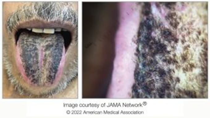 La imagen de la izquierda muestra la mitad inferior de la cara de un hombre mientras saca la lengua, que está cubierta por una gruesa capa negra; la imagen de la derecha muestra un primer plano de la lengua. (Crédito de la imagen: Imagen cortesía de JAMA Network ® / © 2022 American Medical Association)