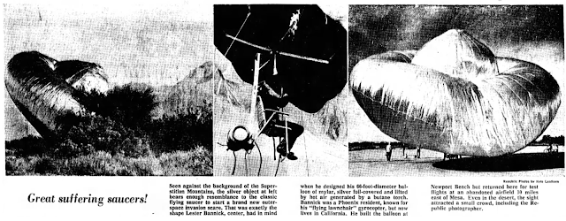 Esa era exactamente la forma que Lester Bannick, en el centro, tenía en mente cuando diseñó su globo de 66 pies de diámetro de mylar, recubierto de papel de plata y elevado por aire caliente generado por un soplete de butano. Bannick era residente en Phoenix, conocido por su autogiro “silla de jardín voladora”, pero ahora vive en California.