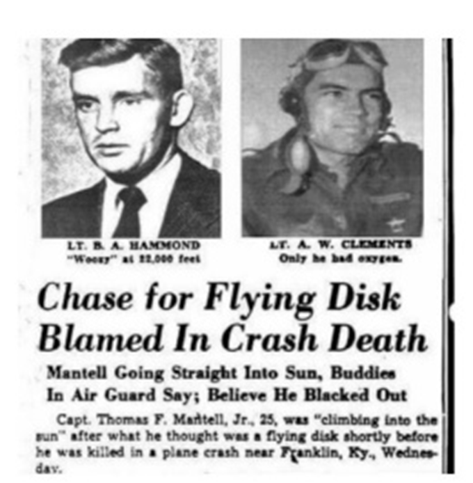 El 7 de enero de 1948, el Capitán Mantell Jr. supuestamente persiguió un Objeto Volador No Identificado con su avión y perdió la vida tras estrellarse en un campo a las afueras de Franklin, Kentucky.