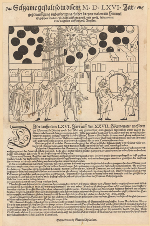 Samuel Apiarus (1530-1590), un impresor itinerante y exitoso que operaba entre Berna, Basilea y Soleura, percibió el anhelo de información y el deseo de una explicación sobre lo que acababa de ocurrir en Basilea. Así, publicó un pequeño panfleto de gran formato , de 18.2 x 23.8 centímetros, que conmemoraba los sucesos sobrenaturales. Samuel Coccius (1548-1626), artista e impresor de Zúrich, colaboró con Apiarius en el diseño del panfleto. Sin embargo, como ninguno de los dos presenció de primera mano las extrañas manifestaciones sobre Basilea, se basaron en fuentes de primera y segunda mano. La escena que eligieron plasmar refleja los sucesos del tercer y último avistamiento. Al contemplar el panfleto, se reconocen de inmediato la distinguible Münsterplatz de Basilea y la Catedral de Basilea. Los espectadores en el tercio inferior del panfleto parecen asombrados y perturbados por las maravillas que se despliegan sobre ellos. Tanto el cielo como el sol están cubiertos por esferas blancas y negras que giran. Cabe destacar especialmente el sol, cuya intensidad es peculiar: sus rayos son salvajes y asimétricos, y su expresión facial es a la vez perturbada y severa.