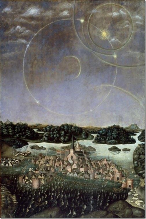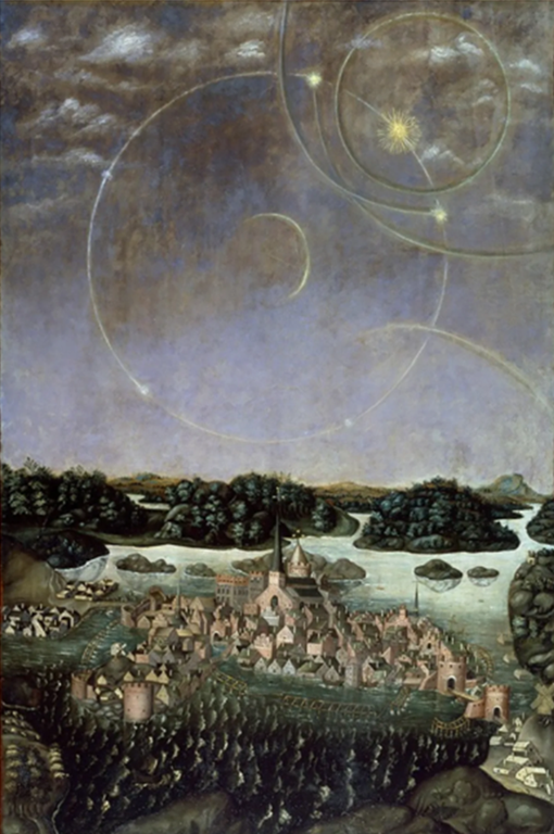 La imagen más antigua conocida de Estocolmo, de 1535, muestra un fenómeno celeste comparable a los de Núremberg y Basilea. Museo de la Ciudad de Estocolmo