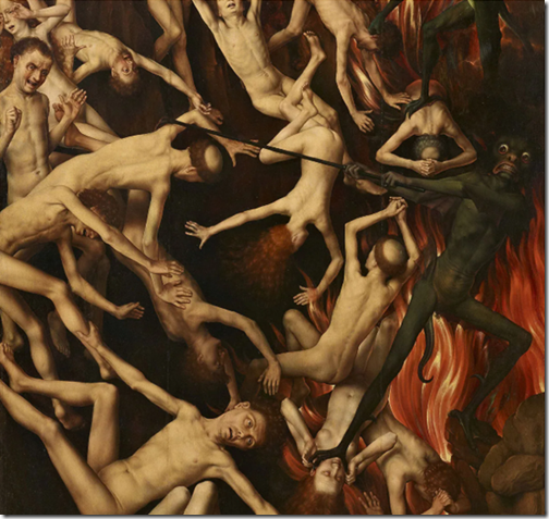 Los tormentos del infierno fueron un tema popular en el arte religioso, incluso en el siglo XVI. Representación del infierno en el tríptico de Hans Memling «El Juicio Final», alrededor de 1470 (detalle). Wikimedia