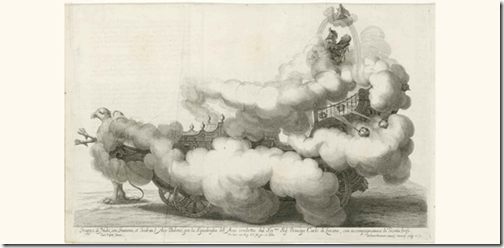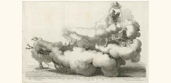 Fig. arriba: Representación de un dirigible fantástico de la fiesta de bodas del emperador Leopoldo I, ilustración de: Sieg-Streit deß Lufft und Wassers Freuden-Fest, Viena, 1667, © Staatliche Museen zu Berlin, Kunstbibliothek