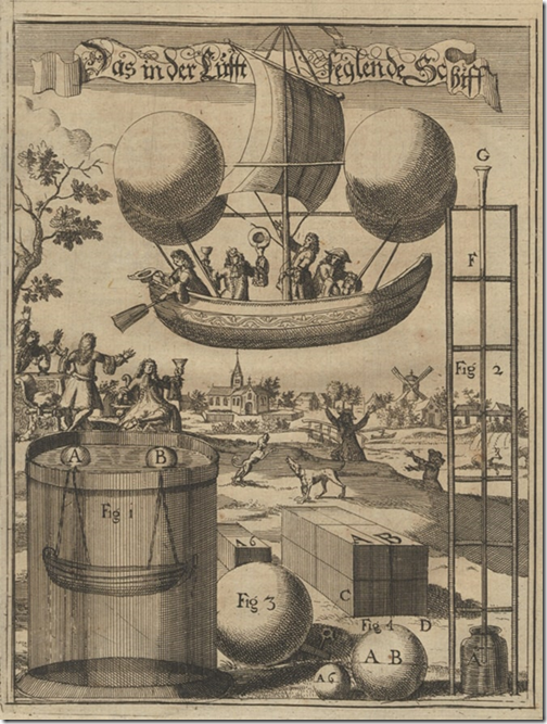 Asimismo, el diseño de imágenes del siglo XVII tuvo una influencia significativa en la transformación mediática del combate aéreo. Las visiones futuristas de dirigibles, que entusiasmaban a la gente del siglo XVII, desempeñaron un papel especial. Más de 100 años antes del primer vuelo tripulado en globo, Francesco Lana Terzi (1631-1687) publicó el diseño de un hidroavión impulsado por esferas de vacío, lo que causó furor en toda Europa. El hecho de que el proyecto nunca se pudiera realizar no atenuó la euforia. La gente soñaba con conquistar el espacio aéreo.