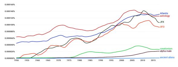 Mucha gente lo cree. Según una encuesta reciente realizada por académicos de la Universidad Chapman, casi el 50 % de los estadounidenses cree en civilizaciones perdidas o en extraterrestres ancestrales. En el visor Ngram de Google Books, que contabiliza las palabras en libros en inglés (no en redes sociales), la mítica ciudad hundida «Atlántida» ocupa un lugar más alto que términos relacionados con otras teorías de la conspiración, como «astrología», «ovni», «JFK», «creacionismo», «macho alfa» o «alienígenas ancestrales». La Atlántida también se menciona más que los famosos yacimientos arqueológicos «Pompeya», la «Esfinge» y «Stonehenge», y que figuras históricas antiguas como «Alejandro Magno».