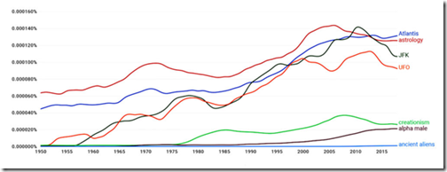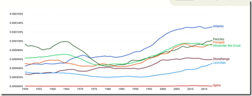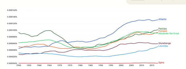 Al comparar la frecuencia de las palabras en los libros en inglés entre 1950 y 2015, el autor rastreó cómo el término “Atlántida” creció hasta superar otras teorías de conspiración populares, sitios arqueológicos reales y figuras reales de la historia antigua. Flint Dibble