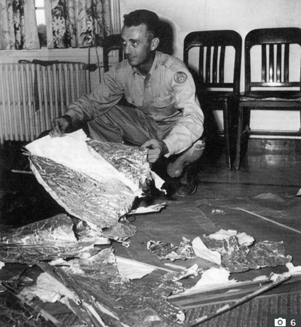El memorando en sí se puede ver en la vieja fotografía que sostiene el general de brigada Roger Ramey, quien en el momento del accidente era comandante de la Octava Fuerza Aérea en Roswell.