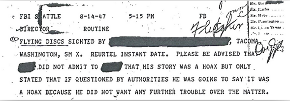 Los archivos del FBI informan que incluso antes del accidente, el 30 de julio, Dahl «quería olvidarse de los discos porque le estaban sucediendo demasiadas cosas malas». Ese mismo día, declaró que «su historia no era falsa ni engañosa». Al día siguiente, Dahl declaró que «no era falsa, pero que ya había tenido suficientes problemas». El FBI informó que los testigos confirmaron que le estaban sucediendo cosas malas, por lo que se mostró reacio a hablar de lo que vio. El 2 de agosto, al día siguiente del accidente, Dahl presentó su plan de afirmar que era un engaño y le dijo a Arnold: «Si el ejército u otras autoridades lo contactaban, diría que toda la historia era un engaño». De igual manera, el 3 de agosto, Dahl confirmó que inventaría el engaño, afirmando que «estaba harto de todo el asunto y que si alguna vez el ejército o las autoridades lo contactaban, negaría haber visto nada y afirmaría ser ‘el mayor mentiroso de la historia'».