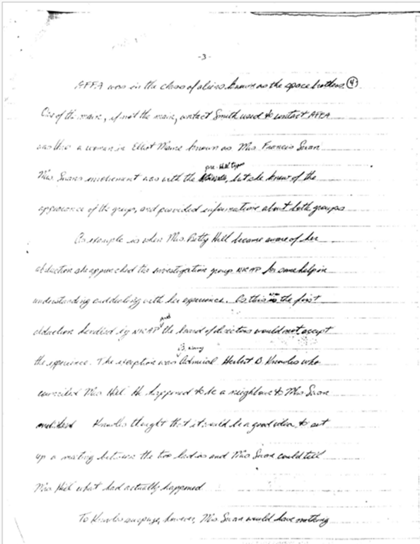 Por ejemplo, cuando la Sra. Betty Hill tomó conciencia de su abducción, se acercó al grupo de investigación NICAP en busca de ayuda para entender y lidiar con su experiencia. Pero esta fue la primera abducción descrita al NICAP y el consejo de directivos no aceptó la experiencia como algo real. La excepción fue el Almirante Herbert B. Knowles, quien consideró que la Sra. Hill vivía cerca de la Sra. Swan. Knowles pensó que sería una buena idea organizar una reunión entre las dos señoras para que la Sra. Swan pudiera contarle a la Sra. Hill lo que realmente había sucedido.