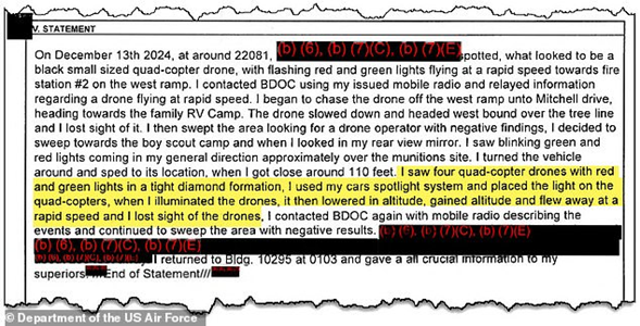Según el personal de la Fuerza Aérea y otros testigos en la zona, los ovnis pueden haber sido parte de los mismos enjambres de drones que cautivaron y aterrorizaron a la nación a fines del año pasado.