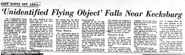 imageEn la imagen: El primer artículo del Greensburg Tribune-Review sobre el incidente ovni de Kecksburg, fechado el 10 de diciembre de 1965.
