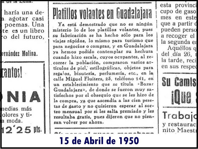 Como ejemplo, encontramos un texto publicado el 15 de abril de aquel año en Nueva Alcarria sobre el citado OVNI: «En Guadalajara ya hemos podido comprobar su hechura cuando hizo escala, cuyos ocupantes, al recorrer la población compraron varios artículos de piel, estilográficas, objetos para regalos, bisutería, perfumería, etc, en la calle Miguel Fluiters 25, en un establecimiento que se titula ‘Bazar de Guadalajara’, de donde se fueron muy satisfechos del obsequio que se les hizo, ya que ascendía a las cien pesetas de gasto y no quisieron esperar al sorteo mensual por si les salía premiado y les salía gratis, pues dijeron que no piensan volver por ahora’.
