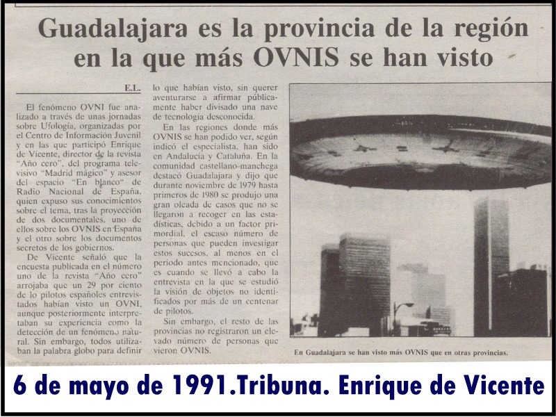 En comparación con el resto de la provincia la capital tuvo pocos avistamientos. Según una entrevista realizada a Enrique de Vicente, asiduo colaborador de los programas de misterio de Iker Jiménez, fundador y director de la revista Año Cero, Guadalajara fue la provincia de la región donde más OVNIs se vieron en los años 70 y 80. Cuando era joven, el periodista recorrió toda la provincia investigando temas ufológicos, acompañado por el doctor, especialista en parapsicología y director del programa de televisión Más Allá, Fernando Jiménez del Oso.