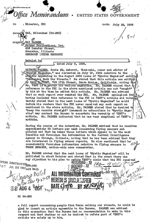 Los archivos del FBI en formato PDF sobre Ray Palmer pueden consultarse en línea (1, 2) como ejemplos de cómo la información dominante ha sido regulada por funcionarios de las jerarquías gubernamentales que tal vez nunca hayan tenido acceso a la amplia gama de información presentada en los artículos de este blog. A continuación se muestra una carta de estos archivos.