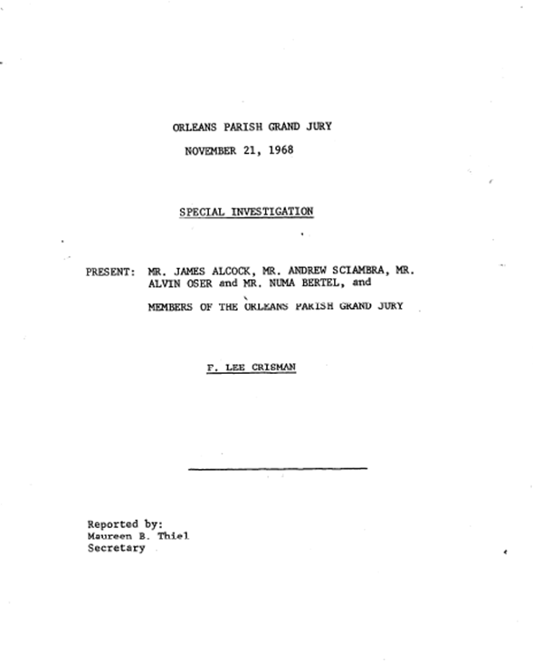 PRESENTES: SR. JAMES ALCOCK, SR. ANDREW SCIAMBRA, SR. ALVIN OSER y SR. NUMA BERTEL, y MIEMBROS DEL GRAN JURADO DE LA PARROQUIA DE ORLEANS.