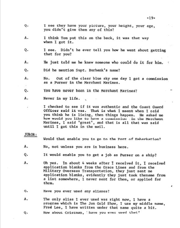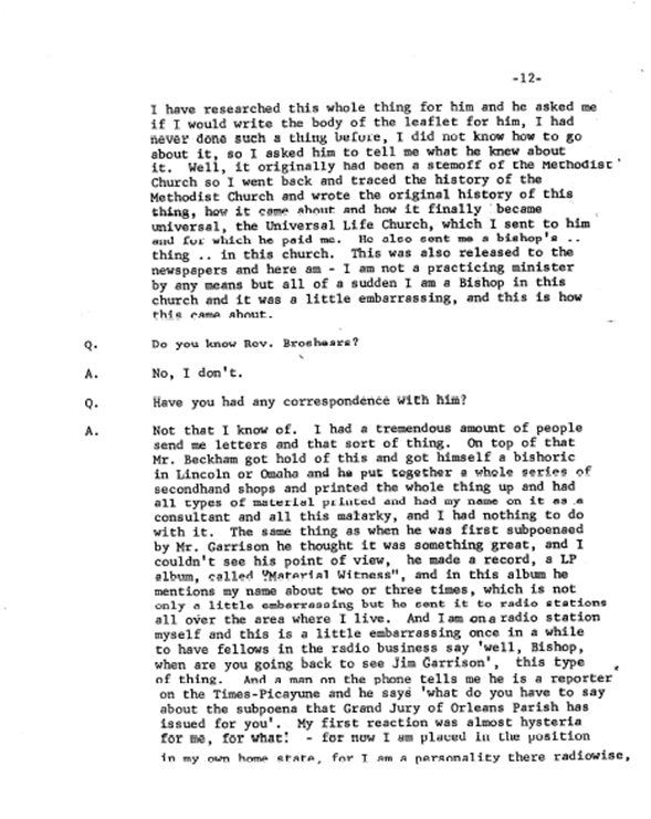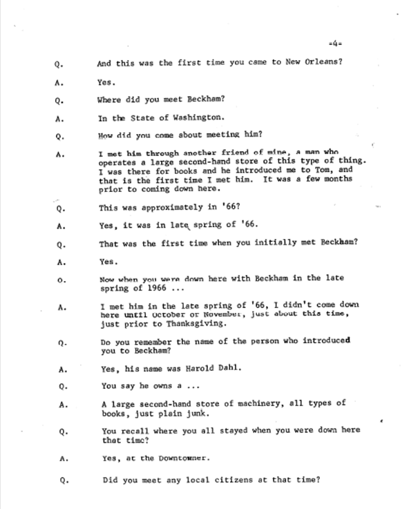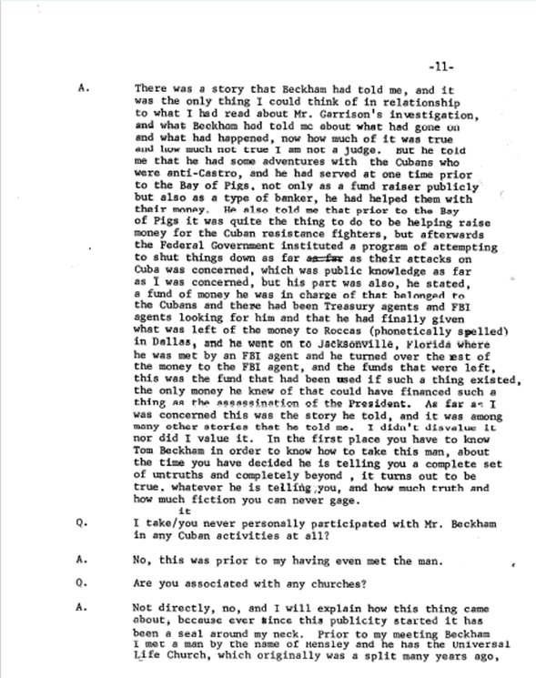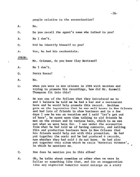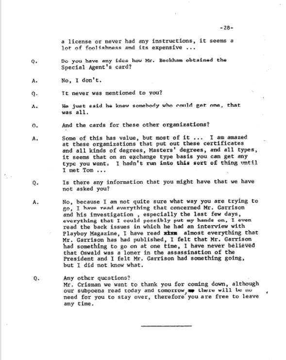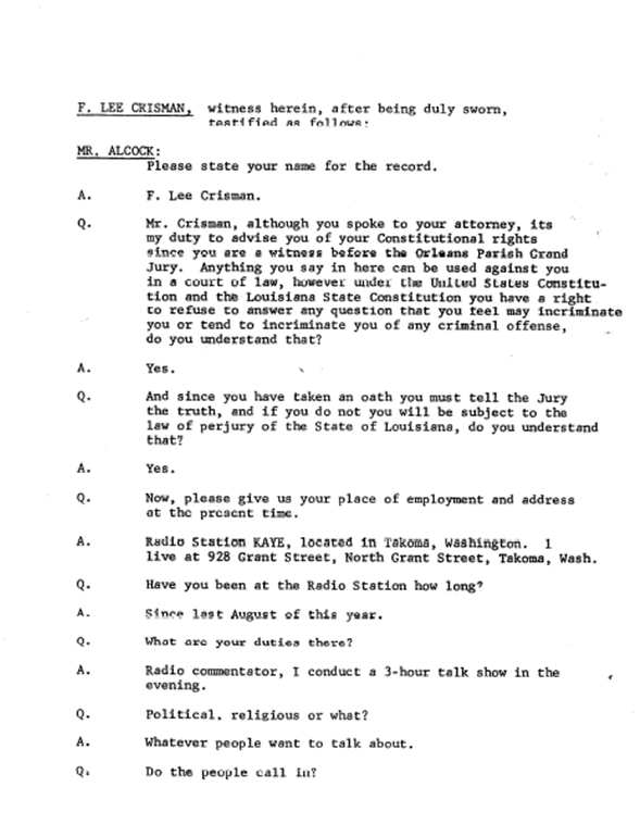 P. Sr. Crisman, aunque habló con su abogado, es mi deber informarle de sus derechos constitucionales ya que es un testigo ante el Gran Jurado de la Parroquia de Orleans. Todo lo que diga aquí puede ser usado en su contra en un tribunal de justicia, sin embargo, bajo la Constitución de los Estados Unidos y la Constitución del Estado de Luisiana, tiene derecho a negarse a responder cualquier pregunta que sienta que puede incriminarlo o tender a incriminarlo en cualquier delito penal, ¿entiende eso?