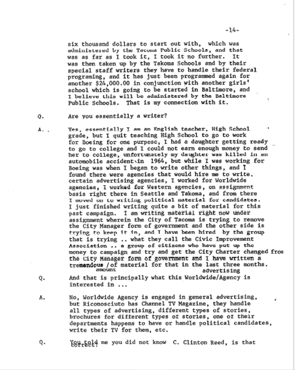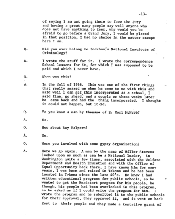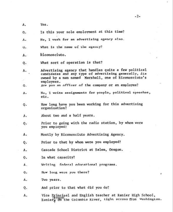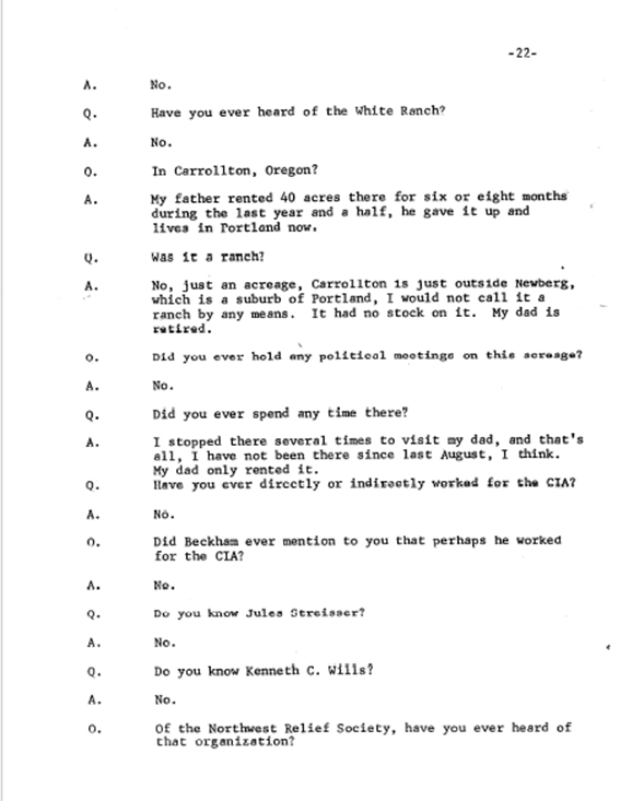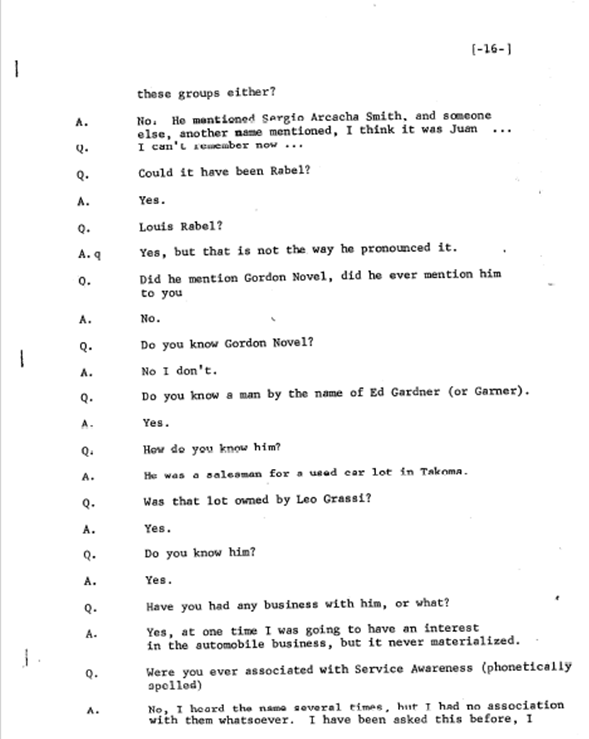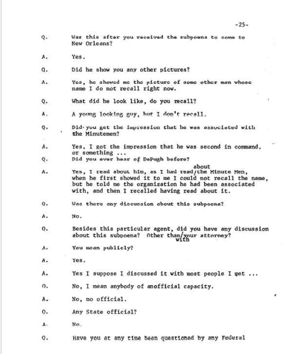 R. Sí, un hombre del FBI vino a mi casa hace unas dos semanas, justo después de que esta publicidad se desatara y trajo una foto de un hombre, creo que su nombre era DePugh, y me preguntó si alguna vez había conocido al hombre, le dije que no y me dijo que tenían un informe de que yo había conocido a este hombre en el noroeste y que había hecho un viaje a México con él, lo cual podría probar fácilmente que no había hecho, y esto es justo lo que le dije y él dijo que tenía el informe y lo estaba investigando. Pareció estar satisfecho con mi historia.