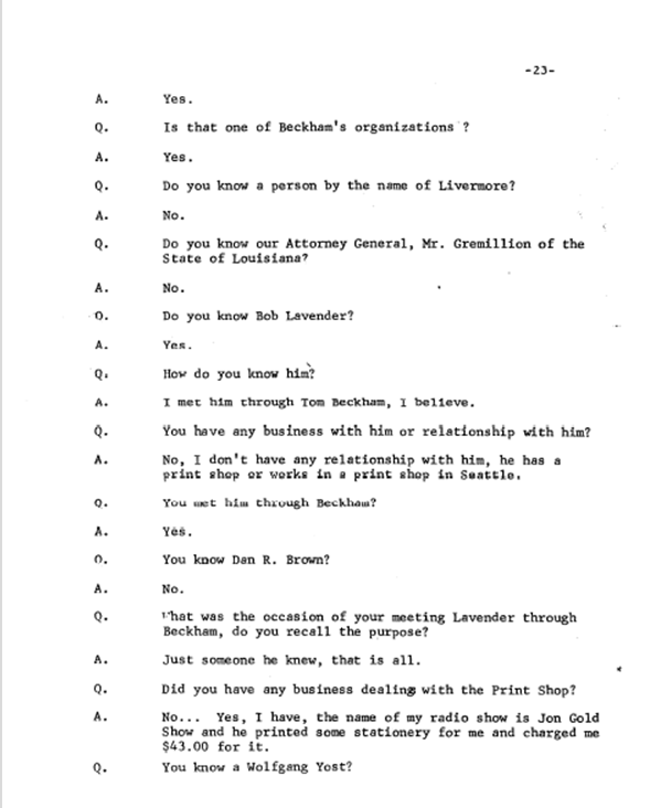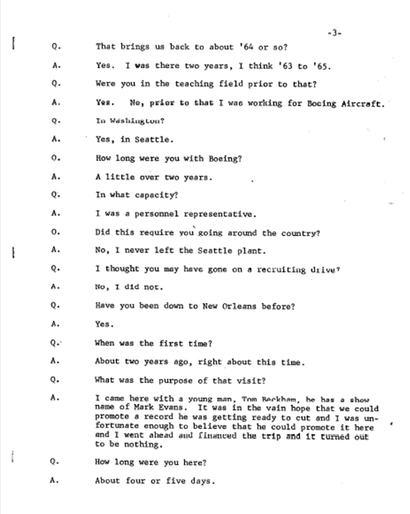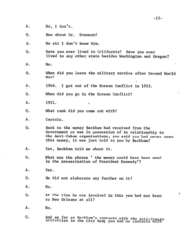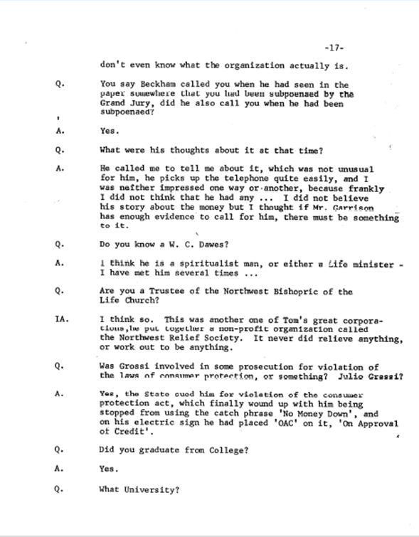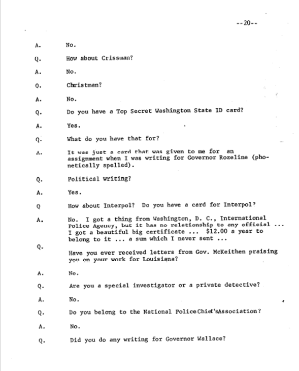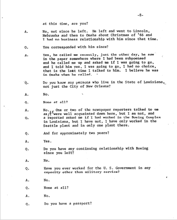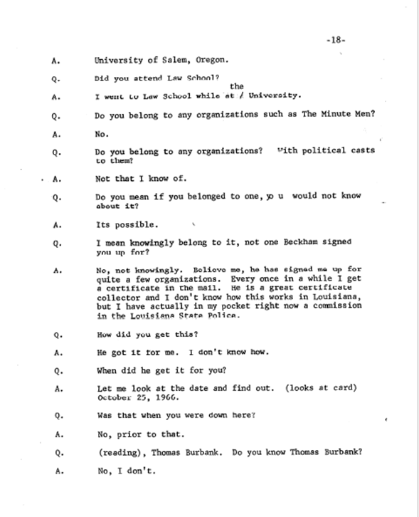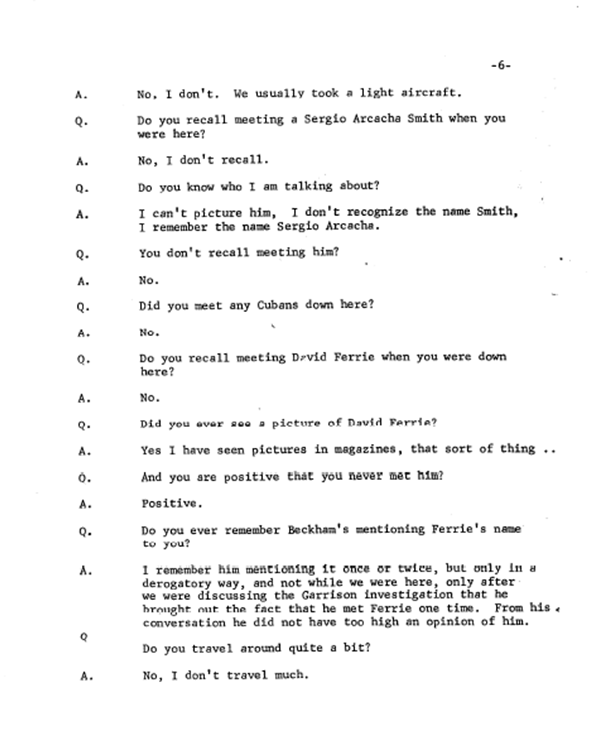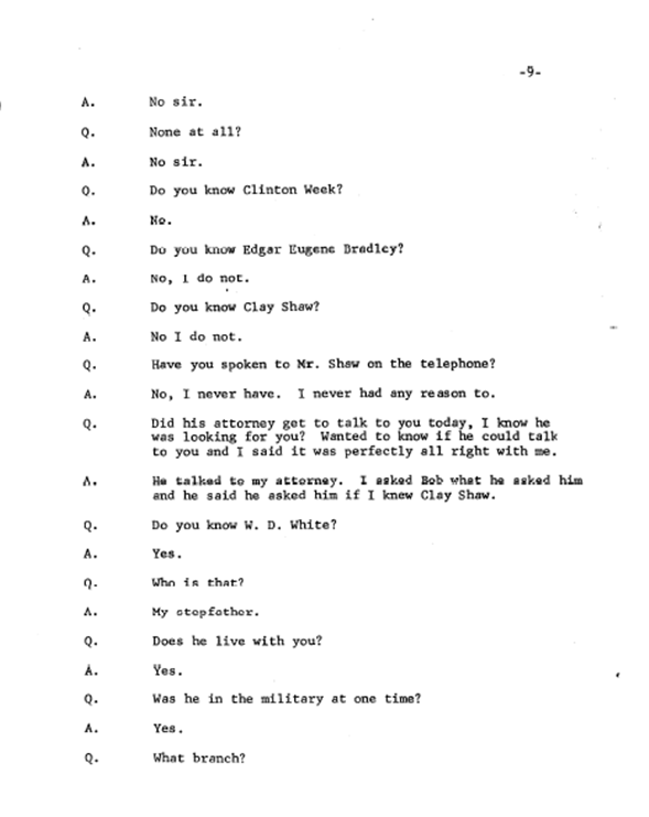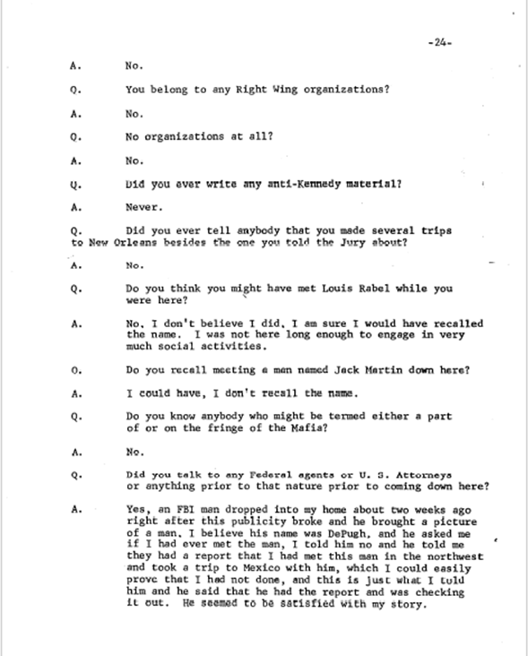 R. No, porque no estoy muy seguro de qué camino está tratando de seguir. He leído todo lo relacionado con el Sr. Garrison y su investigación, especialmente los últimos días, todo lo que he podido conseguir. Incluso he leído los números atrasados en los que concedió una entrevista a la revista Playboy. He leído casi todo lo que el Sr. Garrison ha publicado. En un momento dado, pensé que el Sr. Garrison tenía algo entre manos. Nunca he creído que Oswald actuara solo en el asesinato del presidente y pensaba que el Sr. Garrison tenía algo entre manos, pero no sabía qué.