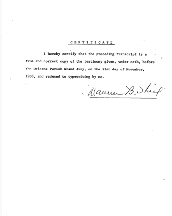 Por la presente, certifico que la transcripción anterior es una copia fiel y correcta del testimonio dado, bajo juramento, ante el Gran Jurado de la Parroquia de Orleans, el 21 de noviembre de 1968, y que ha sido mecanografiada por mí.