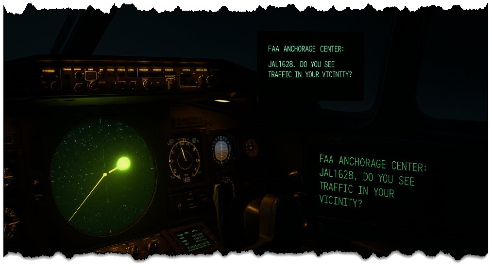 - 17:19: La tripulación del JAL 1628 contacta con el Centro de Control de Tráfico Aéreo de Anchorage (ARTCC) para preguntar si hay tráfico a su altitud (FL350). El controlador responde que no hay otras aeronaves en la zona, pero en ese mismo instante, el capitán Terauchi informa haber visto tráfico con luces brillantes a aproximadamente 1 milla de su 747, a la misma altitud[8]. Al solicitarle señales de identificación, el piloto afirma que solo ven luces estroboscópicas blancas y amarillas en la aeronave desconocida[8]. (El radar de Anchorage no muestra señales de transpondedor en la zona).
