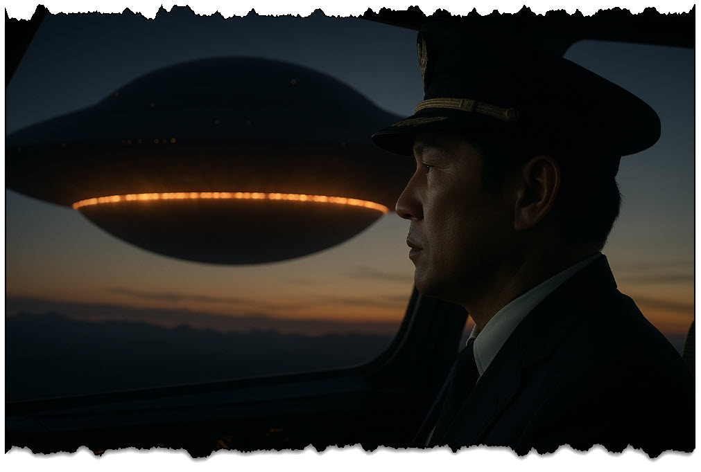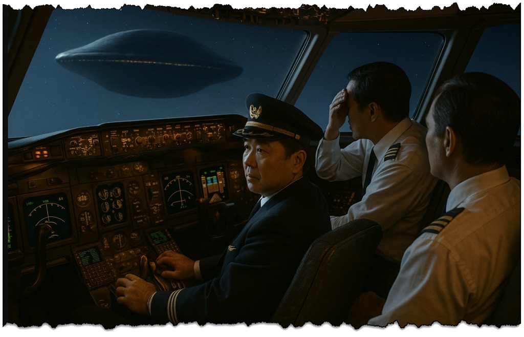Nota: Las imágenes recreadas utilizadas en este artículo para representar los detalles del caso son interpretaciones visuales creadas a partir de los bocetos del capitán Terauchi, el testimonio de la tripulación y la documentación de la FAA. Si bien se hizo todo lo posible por mantenerlas lo más precisas y fieles posible, ciertos detalles del encuentro, como la apariencia y la escala exactas de los objetos, se basan en relatos diversos. Estas imágenes pretenden ilustrar el incidente, no servir como registros fotográficos exactos. Las imágenes de documentos gubernamentales son legítimas y verificadas, y no son reproducciones ni maquetas.