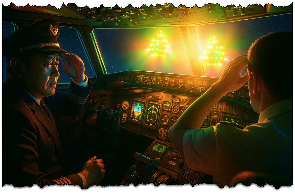 - Encuentro inicial: pequeñas “luces voladoras”: El encuentro comenzó con dos pequeños ovnis que se acercaron al 747. Terauchi y su tripulación notaron primero dos luces de color ámbar a la izquierda, que de repente se elevaron desde abajo y se acercaron para volar junto a su aeronave[42]. Estos objetos tenían una peculiar disposición de luces. Terauchi describió haber visto lo que parecían dos grupos rectangulares de boquillas brillantes o “propulsores”, aunque los cuerpos de la nave estaban oscurecidos por la oscuridad[43]. El par de ovnis se movían alrededor del jumbo jet con gran agilidad, demostrando a veces una aceleración instantánea. Según la tripulación, los objetos “lanzaban luces” y se movían erráticamente, como si estuvieran bajo control inteligente[44]