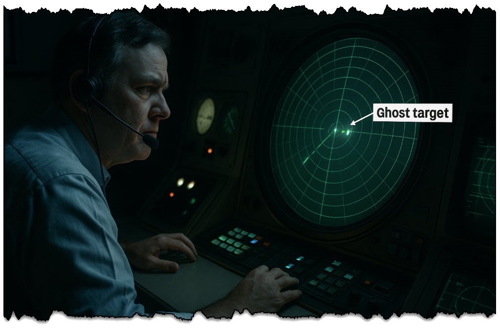 - Si los retornos de radar indican un segundo objetivo discreto o artefactos (por ejemplo, efectos de procesamiento/baliza dividida).