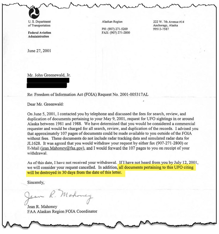 Sin embargo, una carta posterior, fechada el 27 de junio de 2001, declaraba que no se había recibido la retirada, que la solicitud se consideraba cancelada y que «todos los documentos relacionados con este avistamiento ovni serían destruidos en un plazo de 30 días a partir de la fecha de esta carta». Para cuando The Black Vault revisó la carta, el plazo de 30 días ya había vencido. Aunque se envió una carta retirando la solicitud, tal como se había solicitado, esta nunca se recibió, al menos según la FAA.