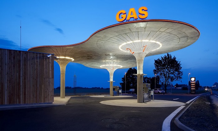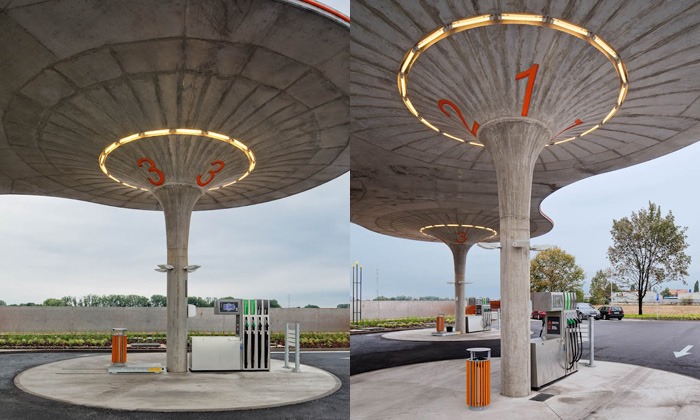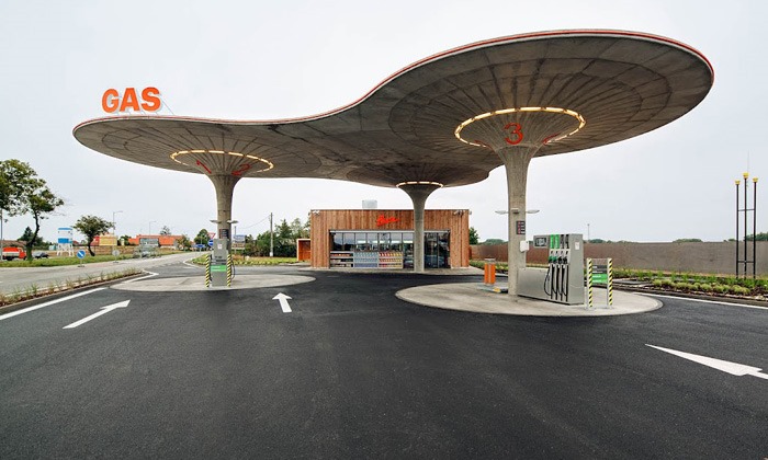 Eslovaquia se está preparando para una red de modernas gasolineras GAS. El primero de ellos, diseñado por el estudio de arquitectura SAD, se encuentra en Matuškov desde el año pasado. La elegante bomba de dos columnas consta de tres embudos gigantes conectados entre sí que, especialmente cuando están iluminados por la noche, se asemejan a misteriosos objetos voladores: ovnis.