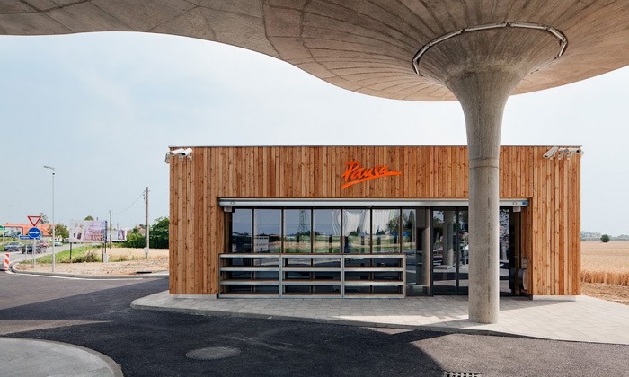 «Estábamos trabajando en un concepto global para crear una red original de gasolineras en la República Eslovaca que se diferenciara significativamente del aspecto actual generalmente aceptado de estos edificios». «El concepto fue desarrollado de forma universal para que la gasolinera mantenga su aspecto característico, desde una estación de servicio individual hasta una gran estación de autopista», comentaron los arquitectos de Atelier SAD.