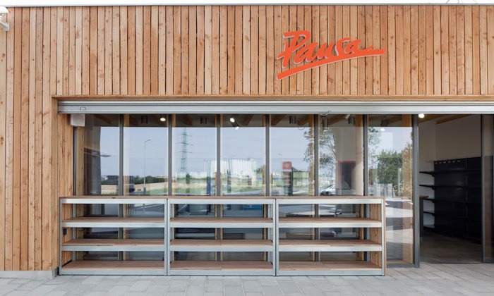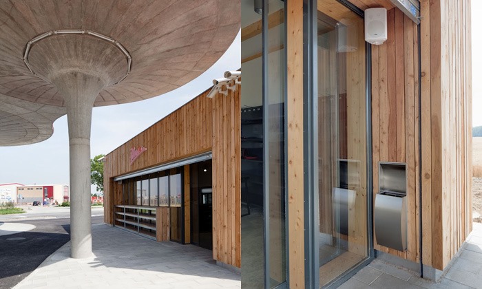 Además de dos gasolineras, la primera de estas bombas ofrece también a los automovilistas instalaciones adecuadas. La sencilla estructura cubista de madera contiene un quiosco de autoservicio con dos cajas registradoras y baños. El personal tiene a su disposición un guardarropa y un pequeño trastero. La tienda es de poca altura, por lo que también es accesible para personas discapacitadas.